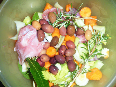 Fate marinare il coniglio per un 'ora con vino e aromi( se potete). Lavate e tagliate sedano, carote e cipolle in pezzetti grossolani. In un tegame unite il coniglio, gli ortaggi, altri aromi freschi( no quelli della marinatura),olive, sale ,pepe, vino , olio e acqua. Amalgamate bene e versate tutto nella pentola a pressione, fate cuocere a fiamma vivace per 20"/25" !